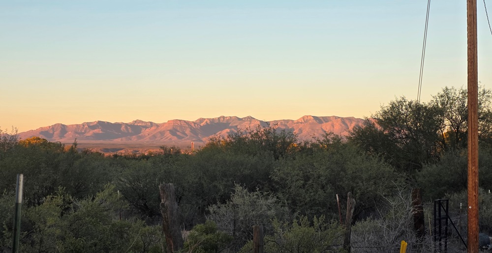 I’m on the western edge of the Chihuahua Desert. This is the view I have (facing west) each early morning as I leave the Hovel to head up to the house for another cup of coffee. Those are the Whetstone Mountains. Just thought I’d share.